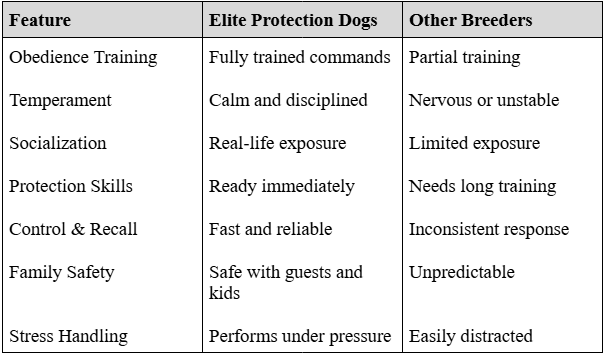 Choosing a fully trained dog from Elite Protection Dogs means you get a loyal, calm, and dependable protector that fits smoothly into your daily life.